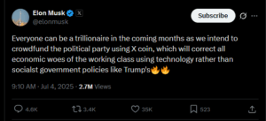 trillionaire Musk panned Trump’s economic policies as “socialist” and promised an end to poverty through investment in X coin. Post author By Kilgoar Post date July 4, 2025 No Comments on trillionaire Leave a Reply Cancel replyYour email address will not be published. Required fields are marked *Comment * Name Email Website Δ